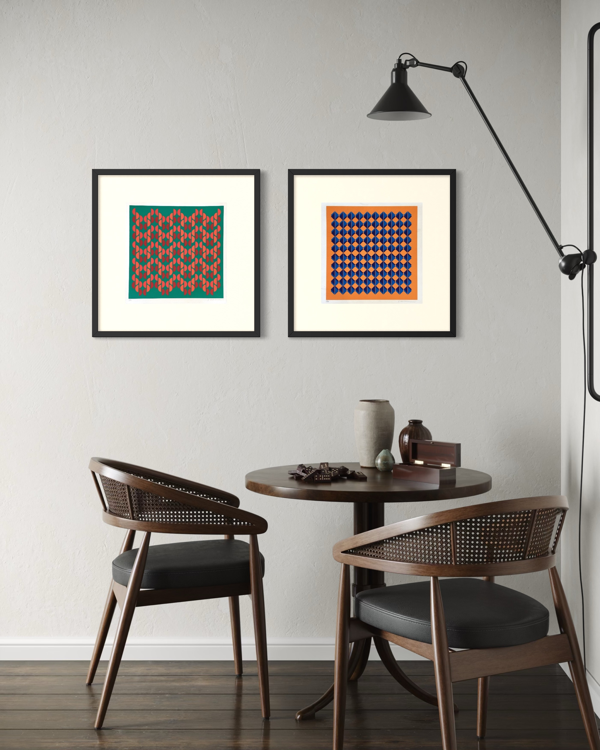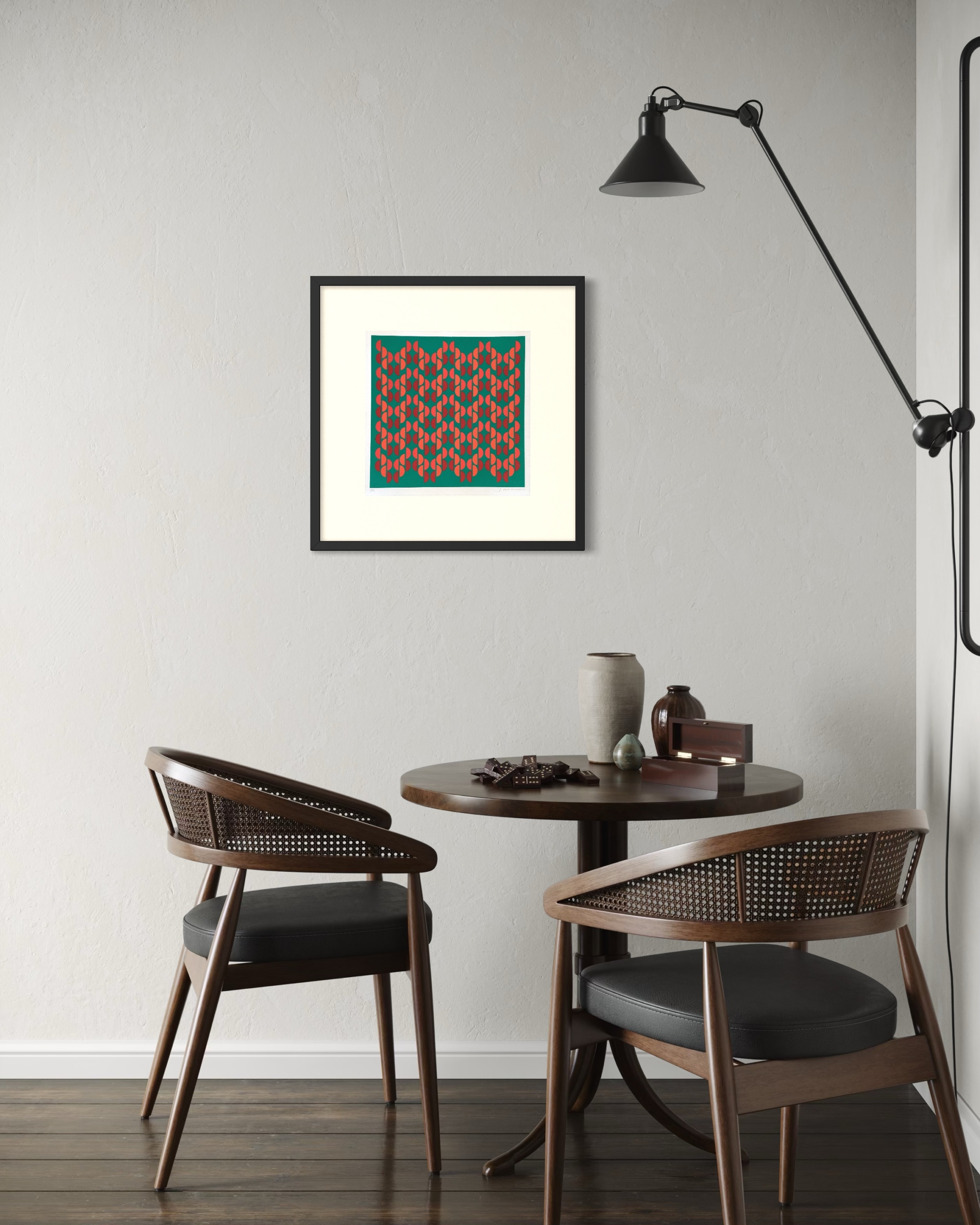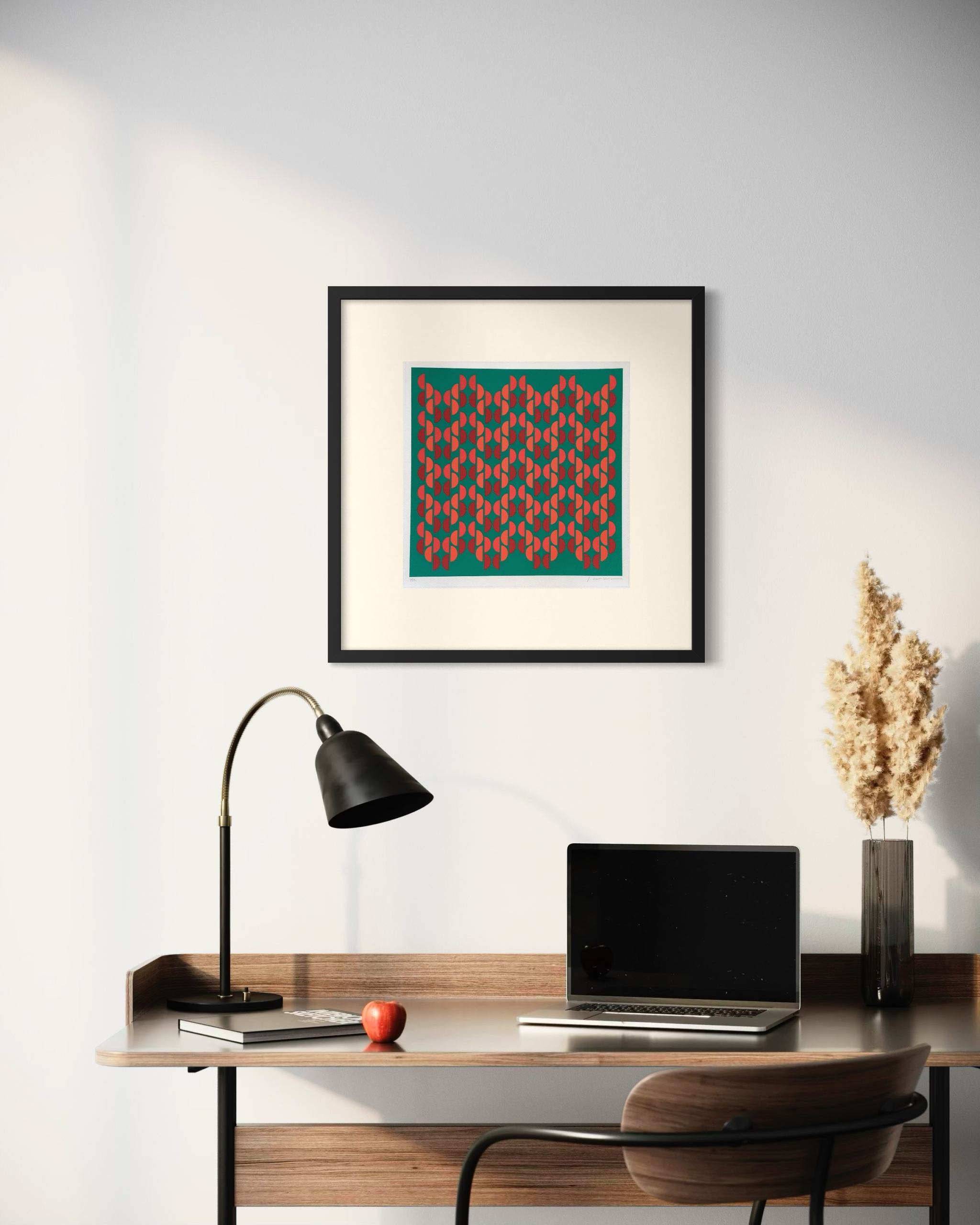 La combinación del verde de fondo con los elementos en rojo crea un contraste equilibrado y contemporáneo, aportando carácter sin saturar el espacio. Es una obra clara, ordenada y visualmente atractiva, ideal para interiores modernos, estudios, escritorios o muros que buscan un acento gráfico con identidad.