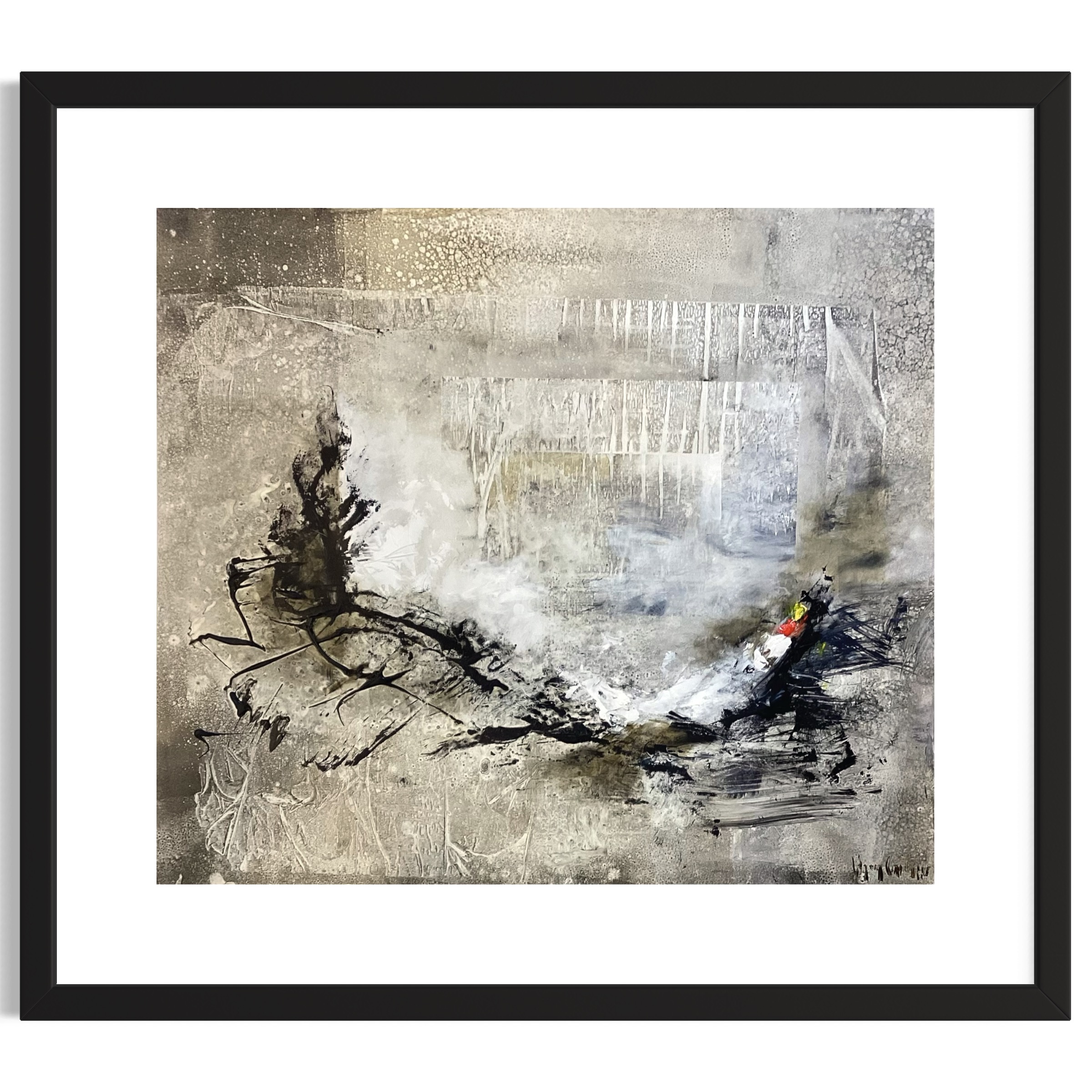 “Neblina Abstracta” es una obra donde Santiago Aránguiz explora la sutileza del movimiento y la textura a través de una paleta de grises, blancos y matices terrosos. El artista logra capturar la sensación de un paisaje velado por la bruma, donde las formas emergen y se desvanecen en una atmósfera de calma y misterio.