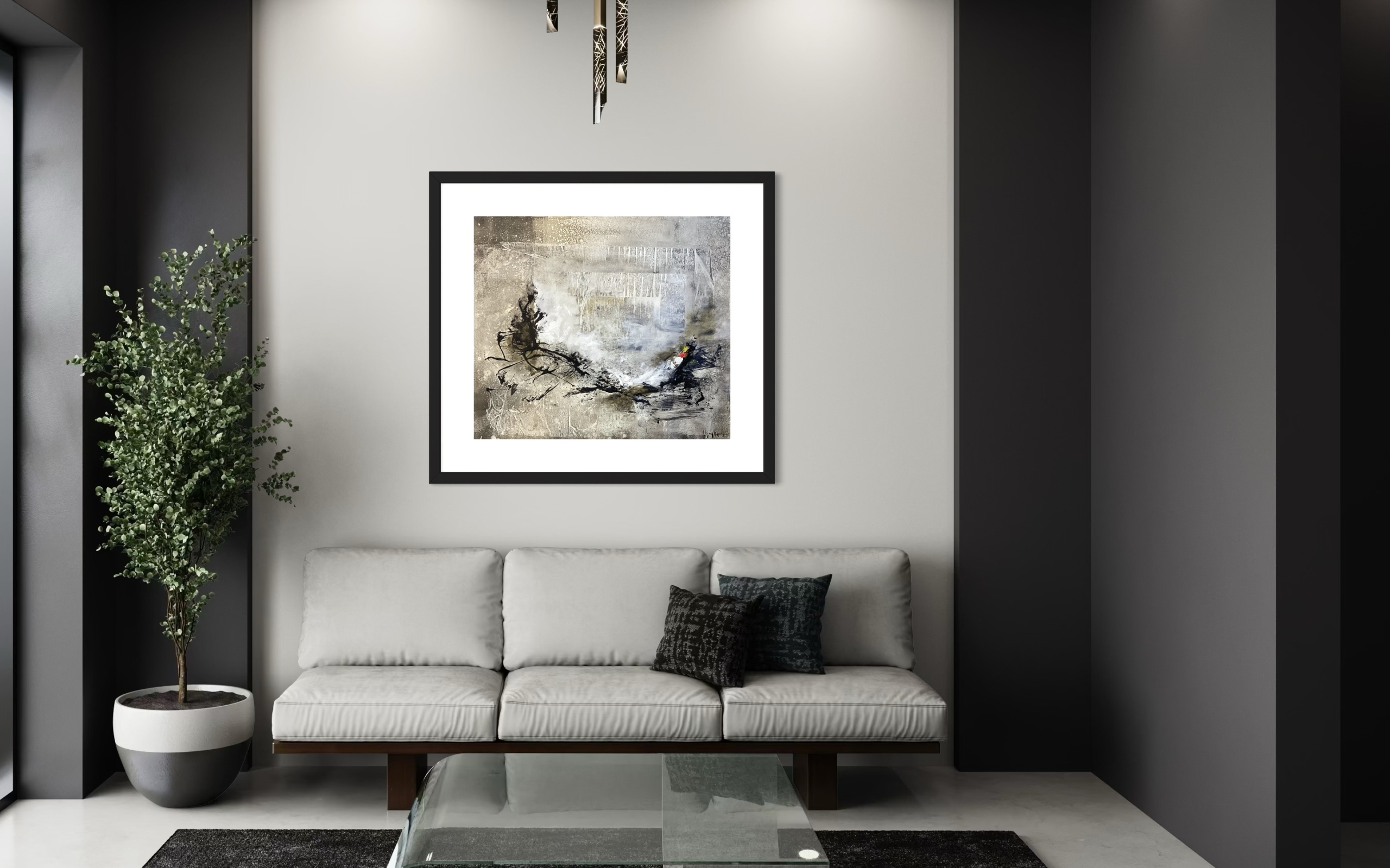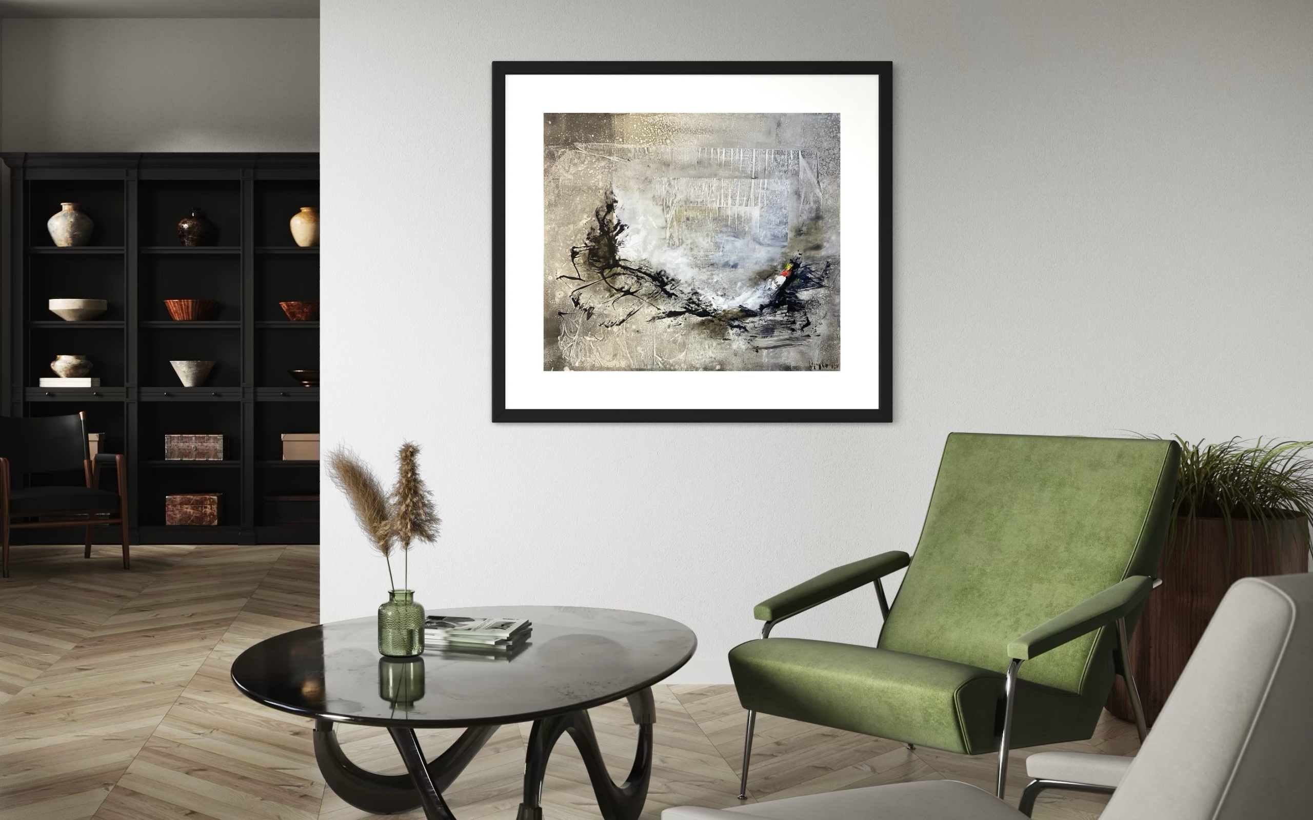 Los trazos oscuros que atraviesan la composición otorgan tensión y contraste, generando un equilibrio perfecto entre lo matérico y lo etéreo. Esta pieza es ideal para espacios amplios, elegantes y contemporáneos, donde su profundidad visual aporte serenidad y carácter.
