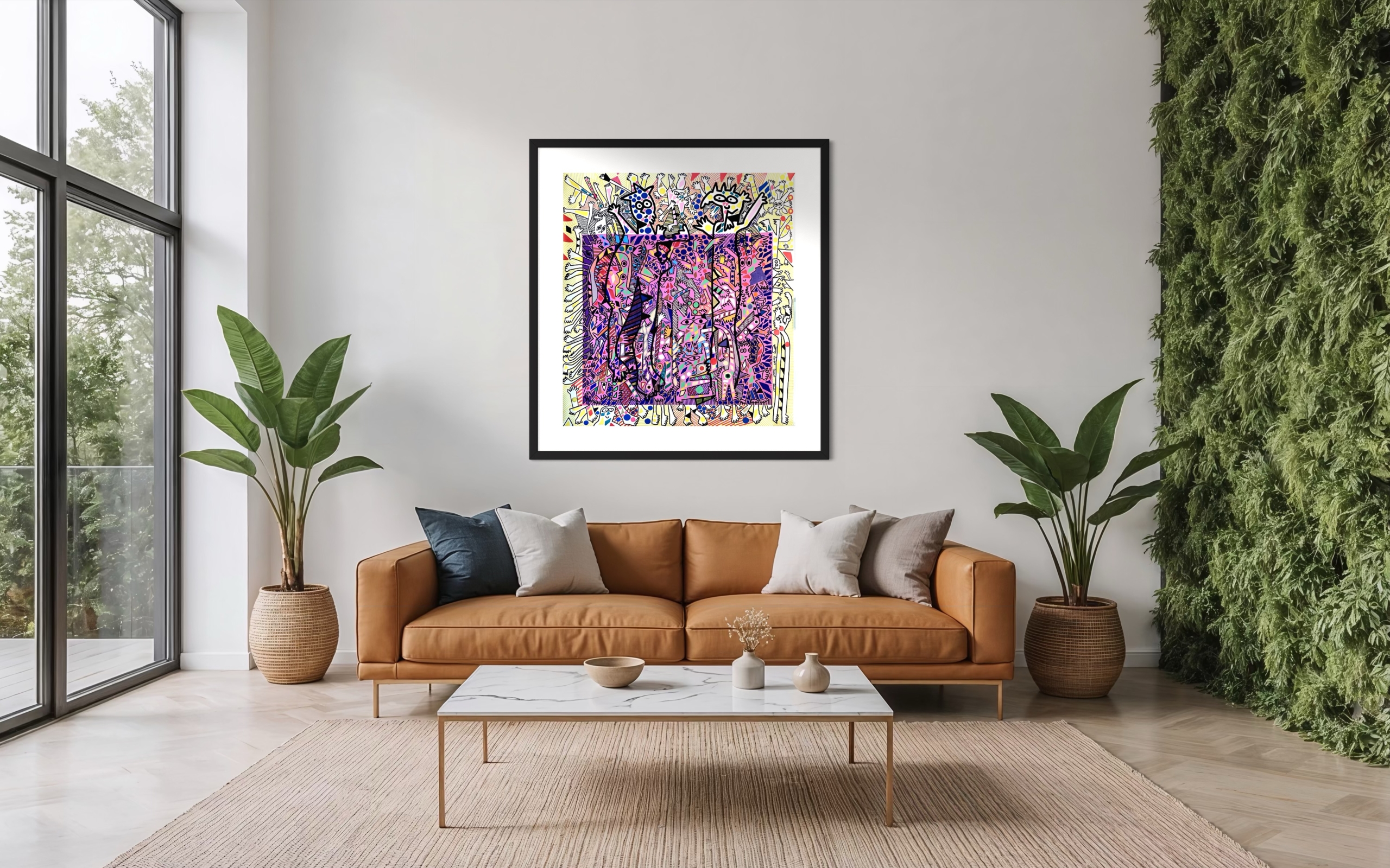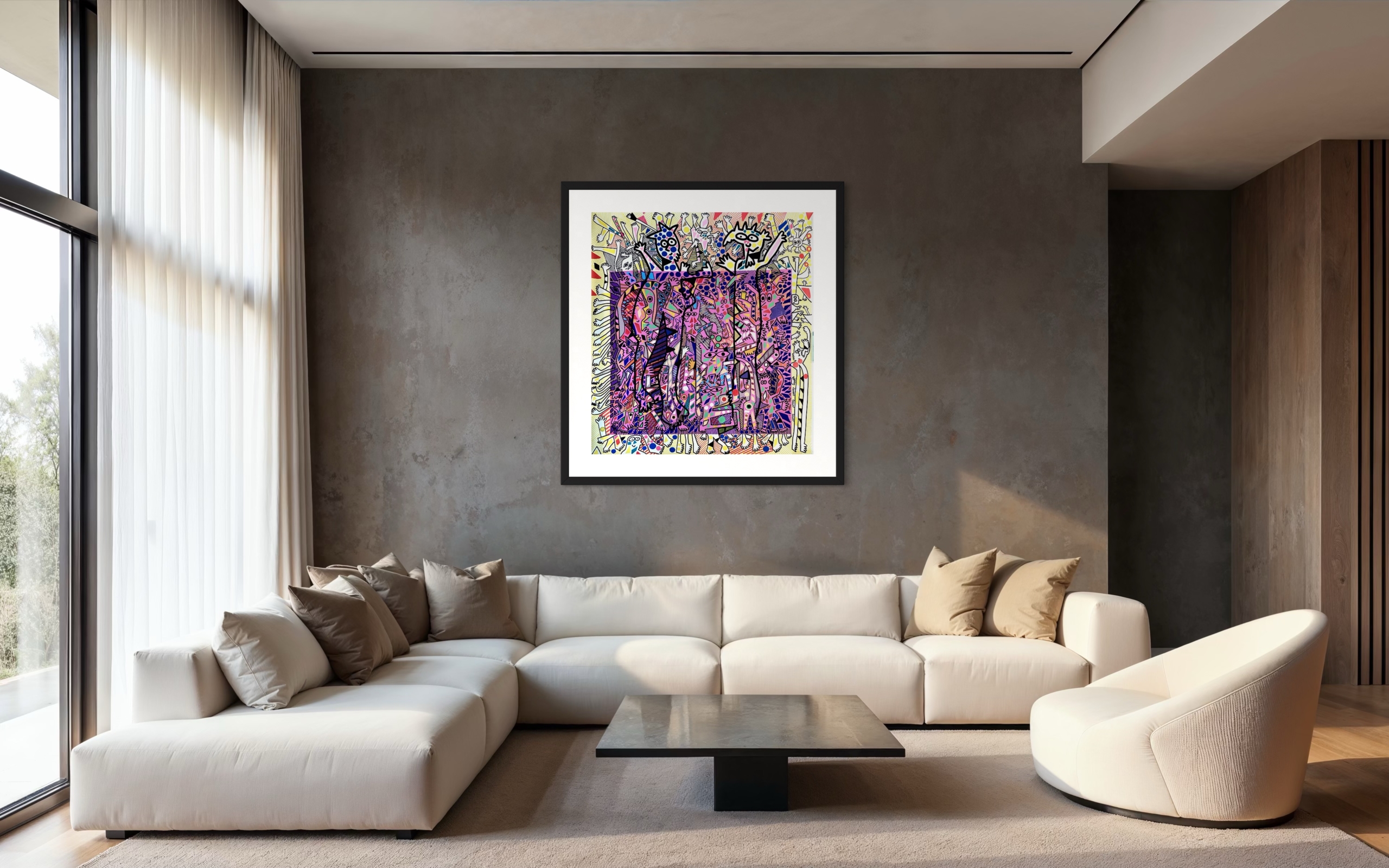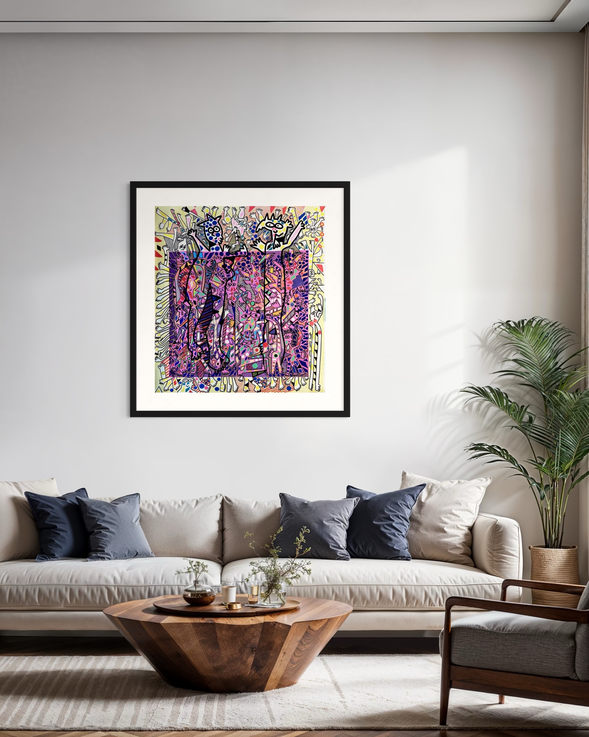 La técnica de acrílico sobre papel, protegida con vidrio museo Ultra UV, garantiza la conservación impecable de la obra, realzando sus colores vibrantes y detalles minuciosos. Su tamaño imponente y composición dinámica la convierten en un verdadero protagonista para livings amplios, salas de arte o espacios corporativos de alto nivel.