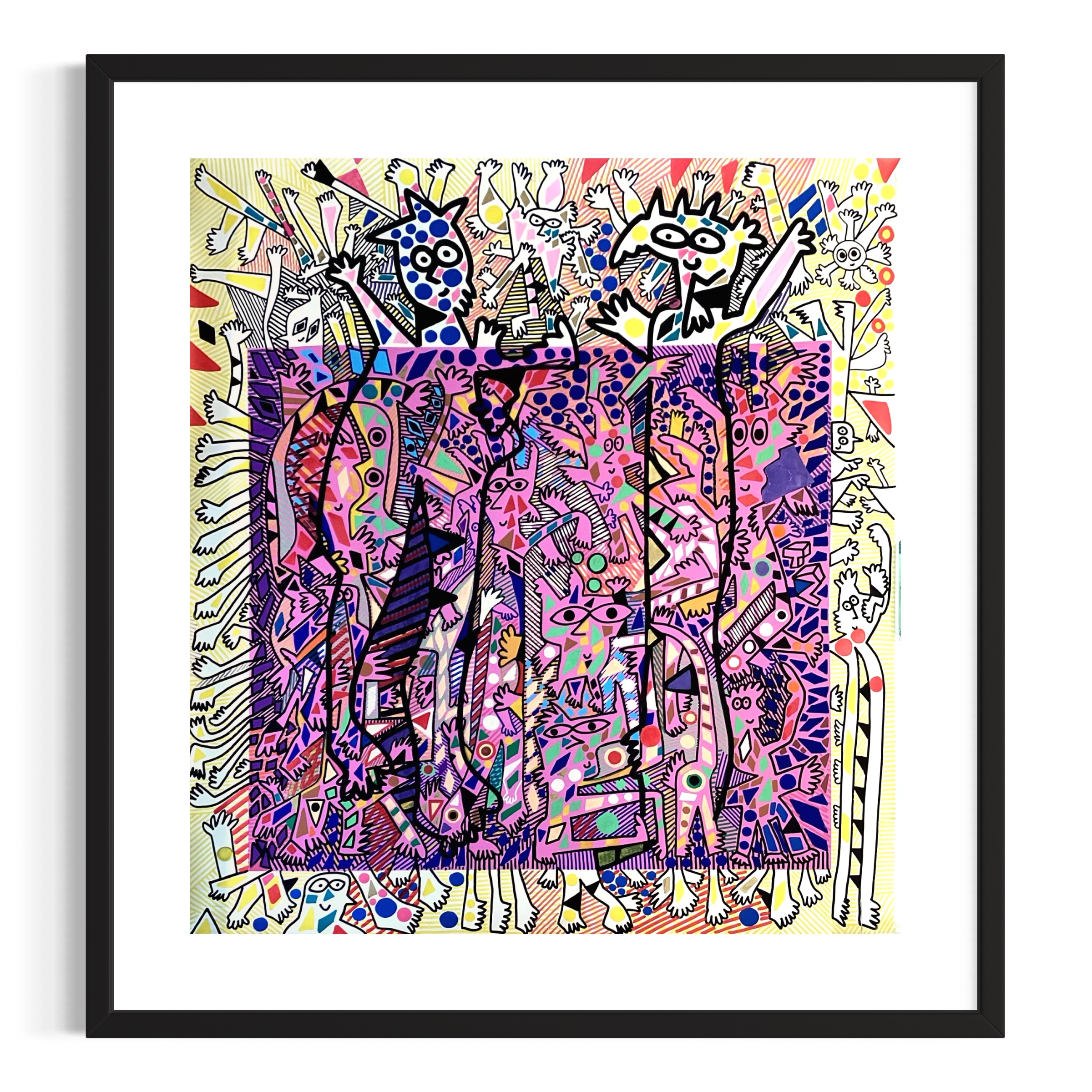 Vertical Gran Formato es una obra donde el artista despliega toda la potencia de su lenguaje visual. Una explosión cromática de tonos rosados, violetas y amarillos, acompañada de figuras y símbolos propios de su imaginario, crea un entramado que invita a la contemplación y al descubrimiento constante.