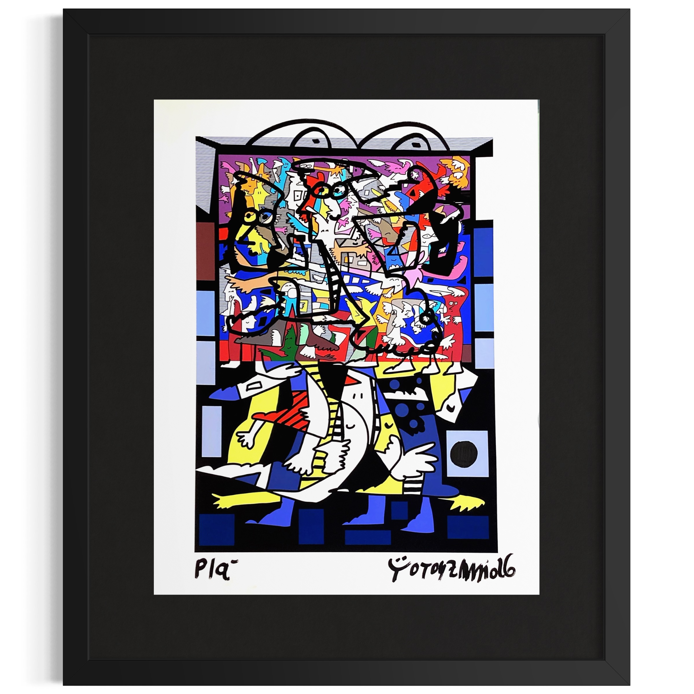 El óleo sobre papel potencia la intensidad cromática y la fuerza del trazo negro, que estructura toda la imagen. La obra combina fragmentación, humor y caos controlado, logrando una escena compleja pero perfectamente equilibrada. Cada sección del cuadro invita a una lectura distinta, generando movimiento y profundidad visual.