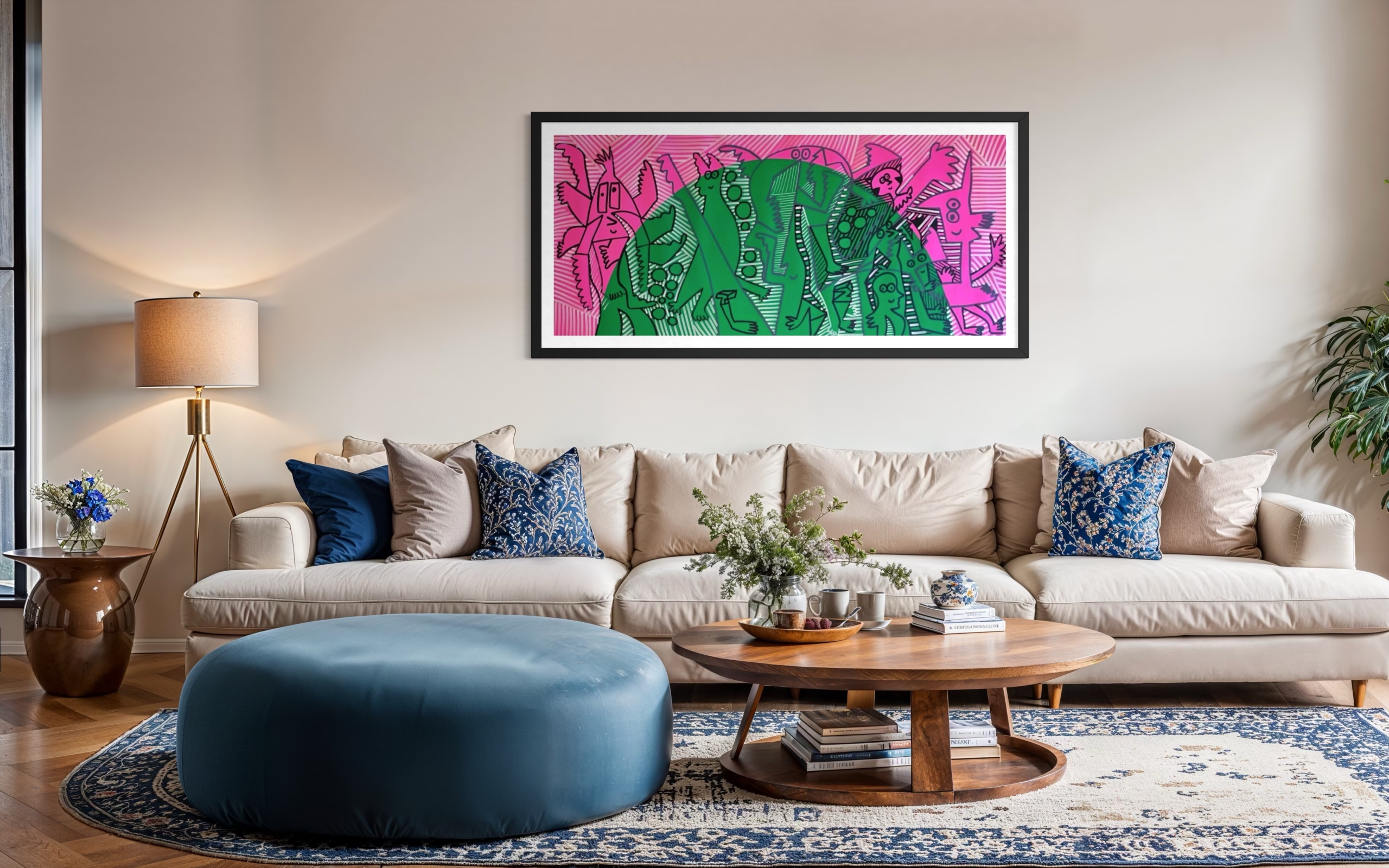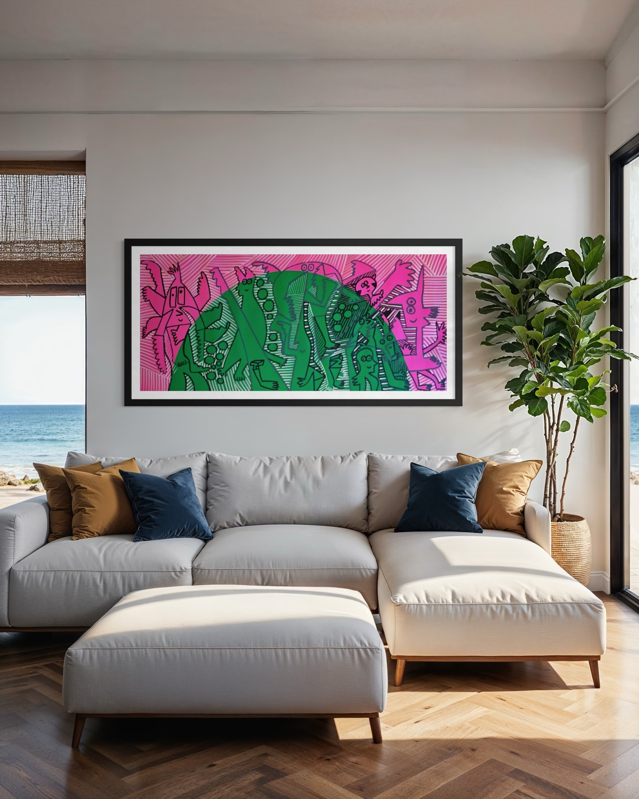 El formato horizontal de 190 x 90 cm permite que la obra destaque con gran fuerza en espacios amplios, siendo ideal para livings contemporáneos, proyectos de interiorismo o colecciones privadas que buscan una obra original de Totoy Zamudio.