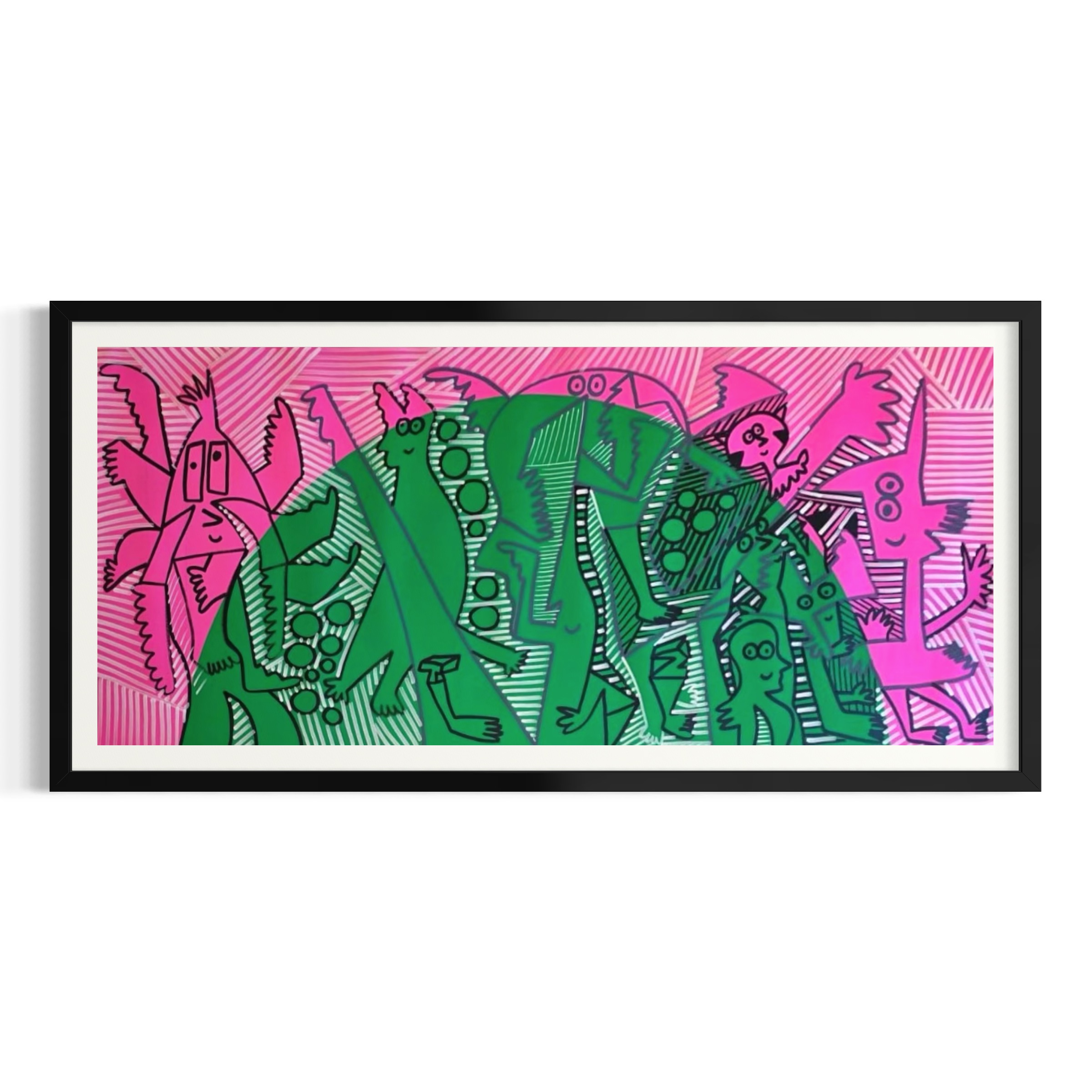 En esta pintura, Zamudio desarrolla una escena vibrante donde los contrastes entre rosados intensos y verdes profundos construyen una composición llena de ritmo y energía visual. Las figuras y formas gráficas características del artista aparecen entrelazadas, generando múltiples lecturas dentro de la obra y una fuerte presencia estética.